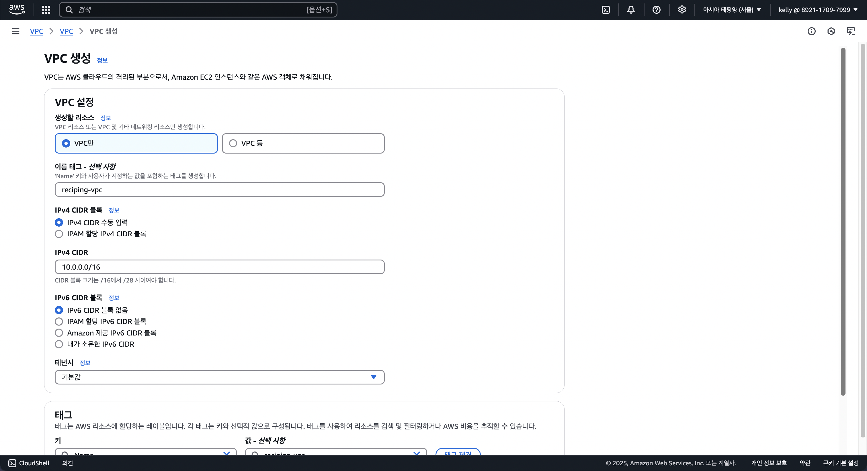 VPC 생성 클릭VPC만 으로 만들고, IPv4 CIDR는 쉽게 AWS default VPC 범위 그대로 가져가도록 합니다. 나머지는 IPv6은 필요없고 테넌시도 그대로 가져가도록 합니다. ( VPC등 은 자동으로 나머지것들까지 만들어주는데 세부적인 서브넷팅이 불가능합니다.)태그를 작성하는 이유는 분간하기 쉽게 하기 위함입니다. 보통 하나만 설정하는 VPC 말고 서브넷같이 양이 많은 걸 분류할 때 보통 태그를 안 해두면 subnet3239141784120..이런 식으로 떠서 구분하기 쉽게 보기 위함도 있습니다.VPC 생성 완료