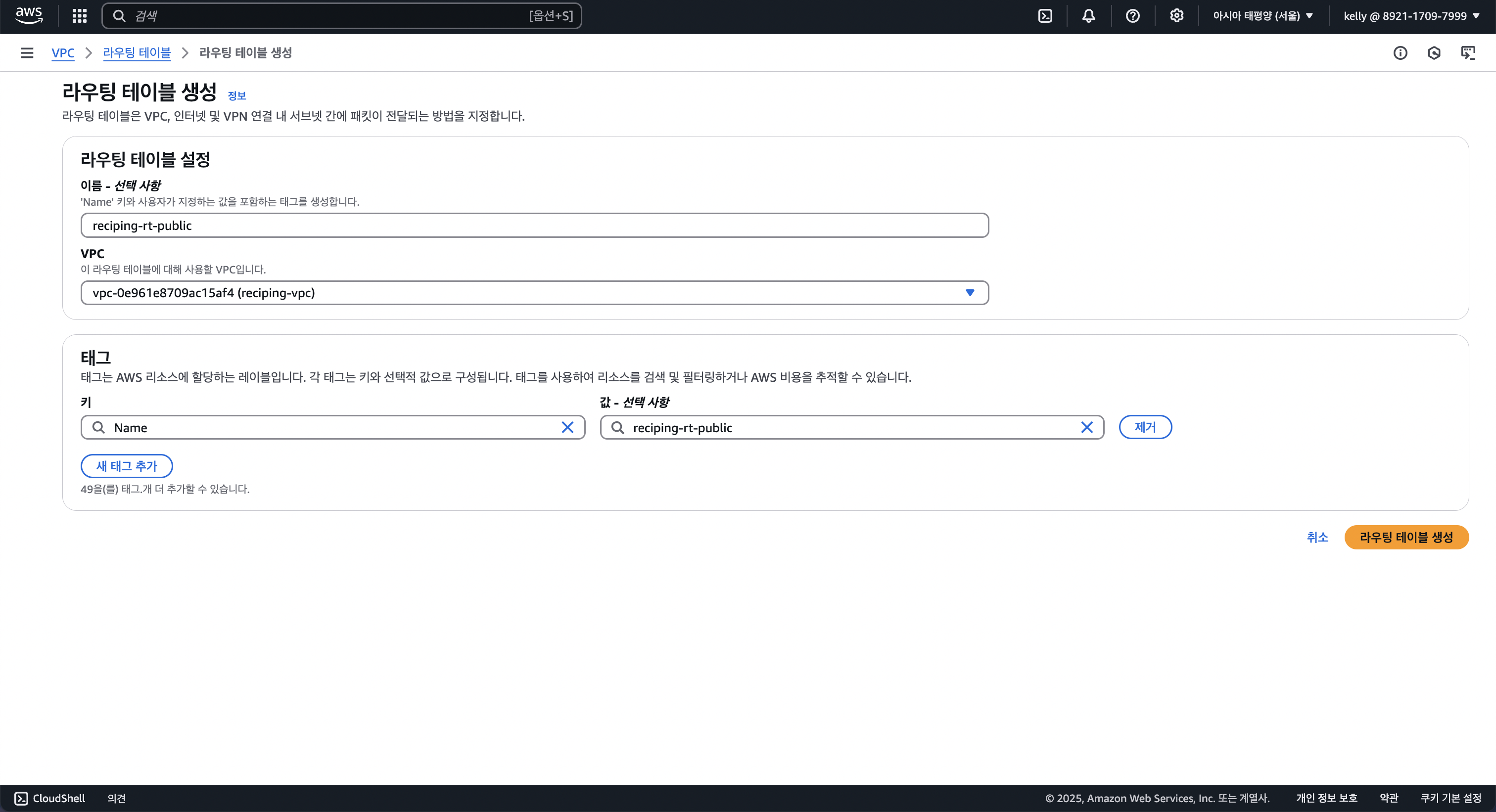다시 라우팅 테이블에 들어가서 reciping-rt-public 선택 후, 라우팅 편집 클릭라우팅 추가 선택 후, 인터넷 게이트웨이 선택, 만들어둔 reciping-igw 클릭 후 변경 사항 저장 클릭최종 결과 화면