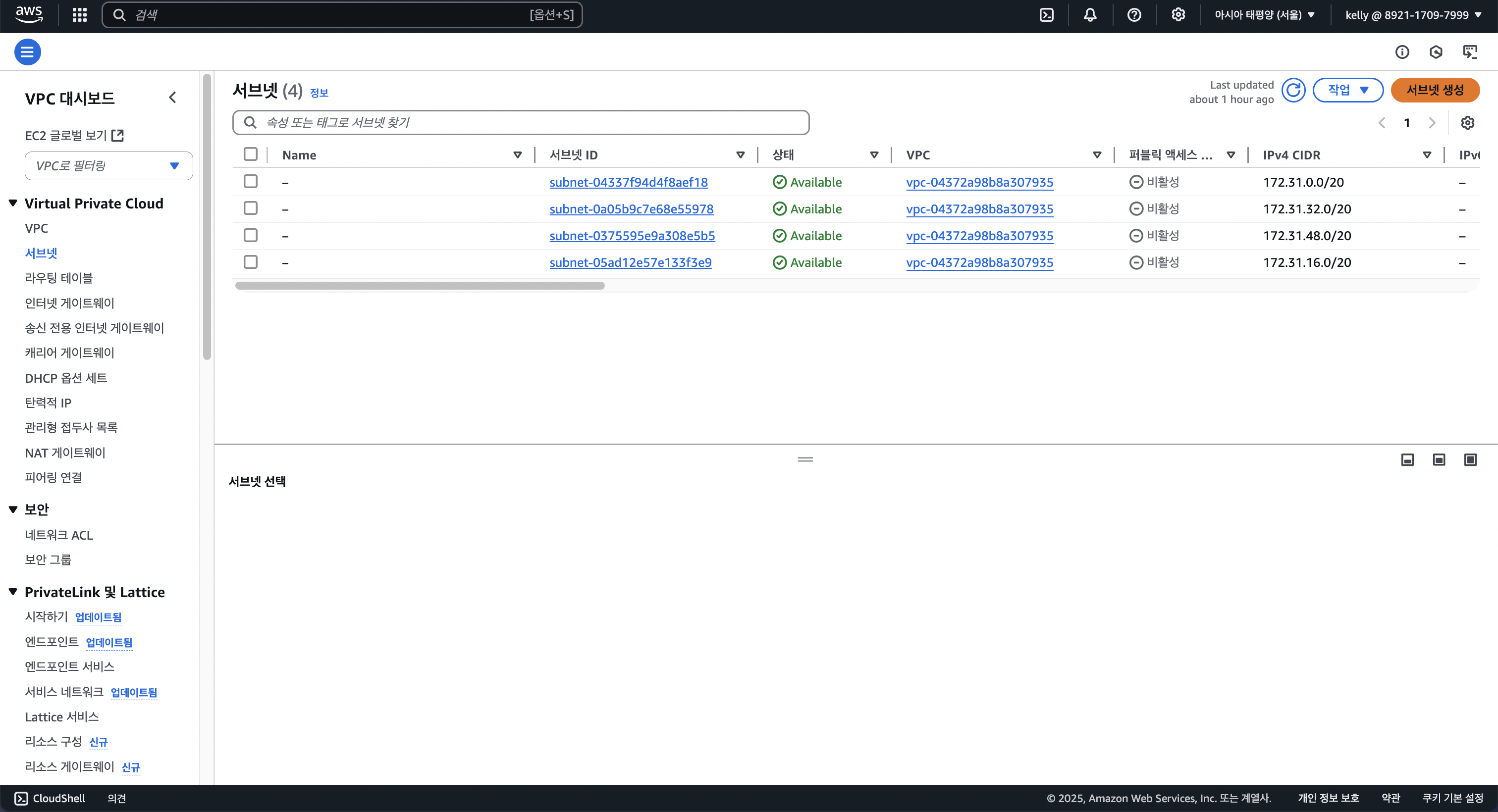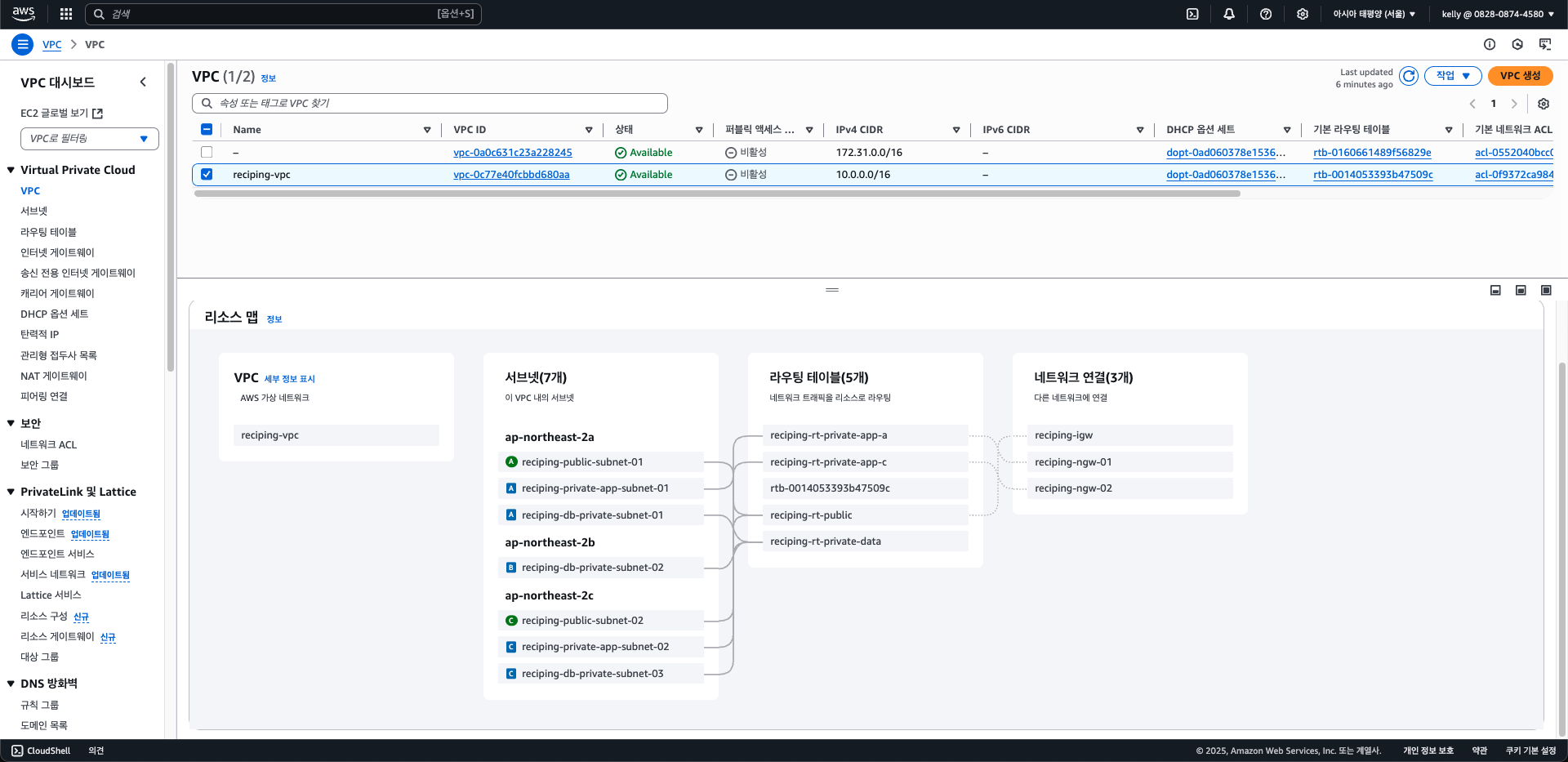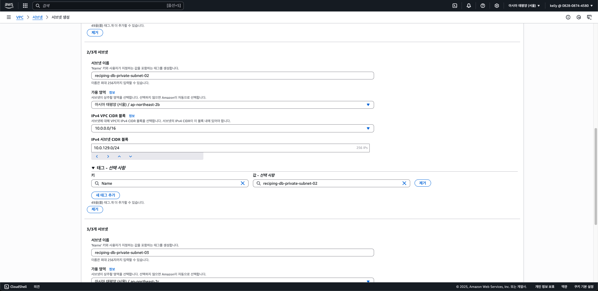 아까 만든 reciping-vpc 선택 후, 가용영역 a 에 10.0.0.0/20 으로 퍼블릭 서브넷 01 생성가용영역 c 에 10.0.16.0/20 으로 퍼블릭 서브넷 02 생성가용영역 a 에 10.0.64.0/20 으로 프라이빗 서브넷 01 생성가용영역 c 에 10.0.80.0/20 으로 프라이빗 서브넷 02 생성application level 서브넷들 생성 완료
