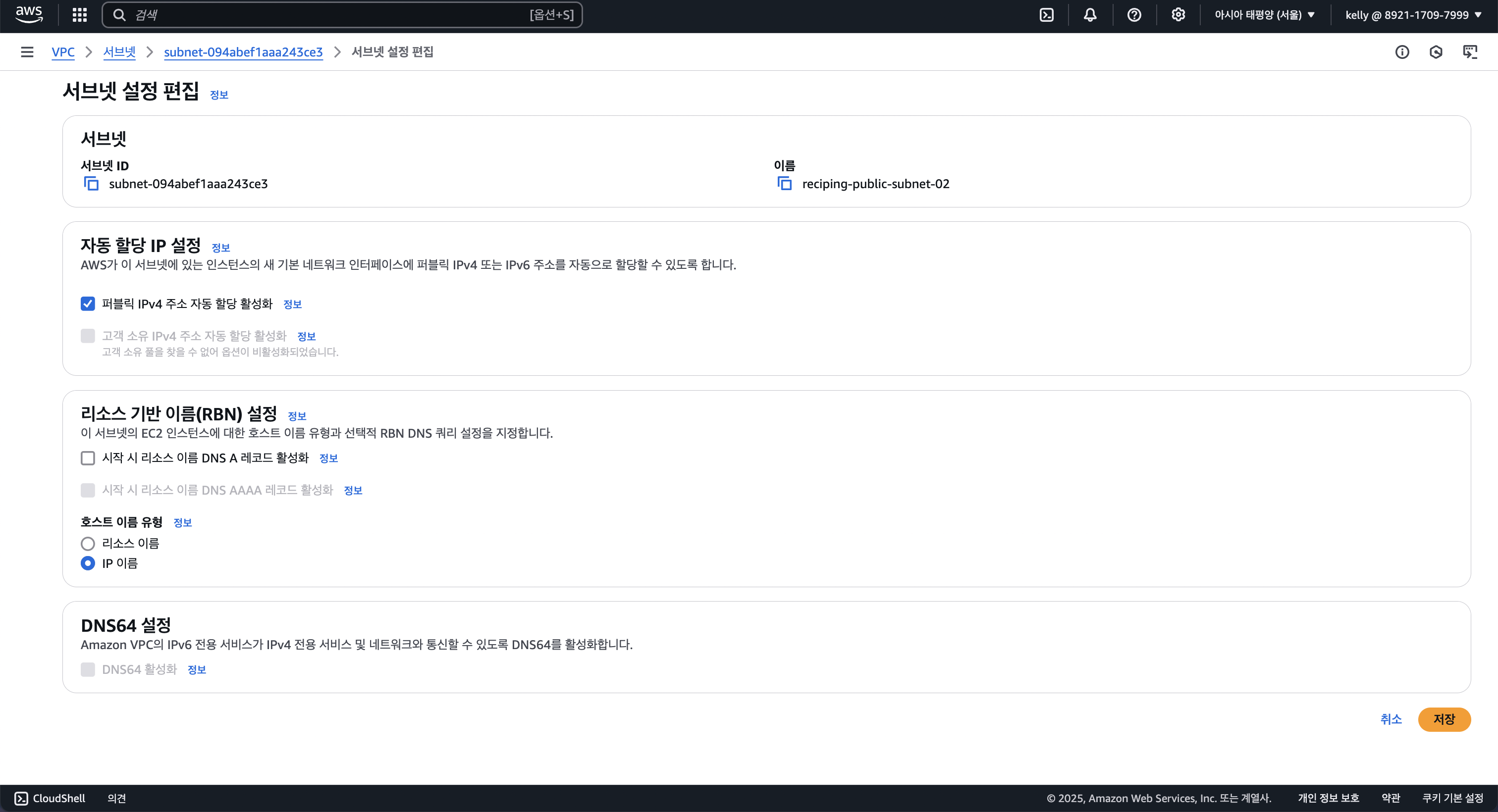 퍼블릭 서브넷 선택 후, 서브넷 설정 편집 클릭퍼블릭 IPv4 주소 자동 할당 활성화 클릭 후 저장 (나머지 남은 퍼블릿 서브넷도 똑같이 저장해두기)