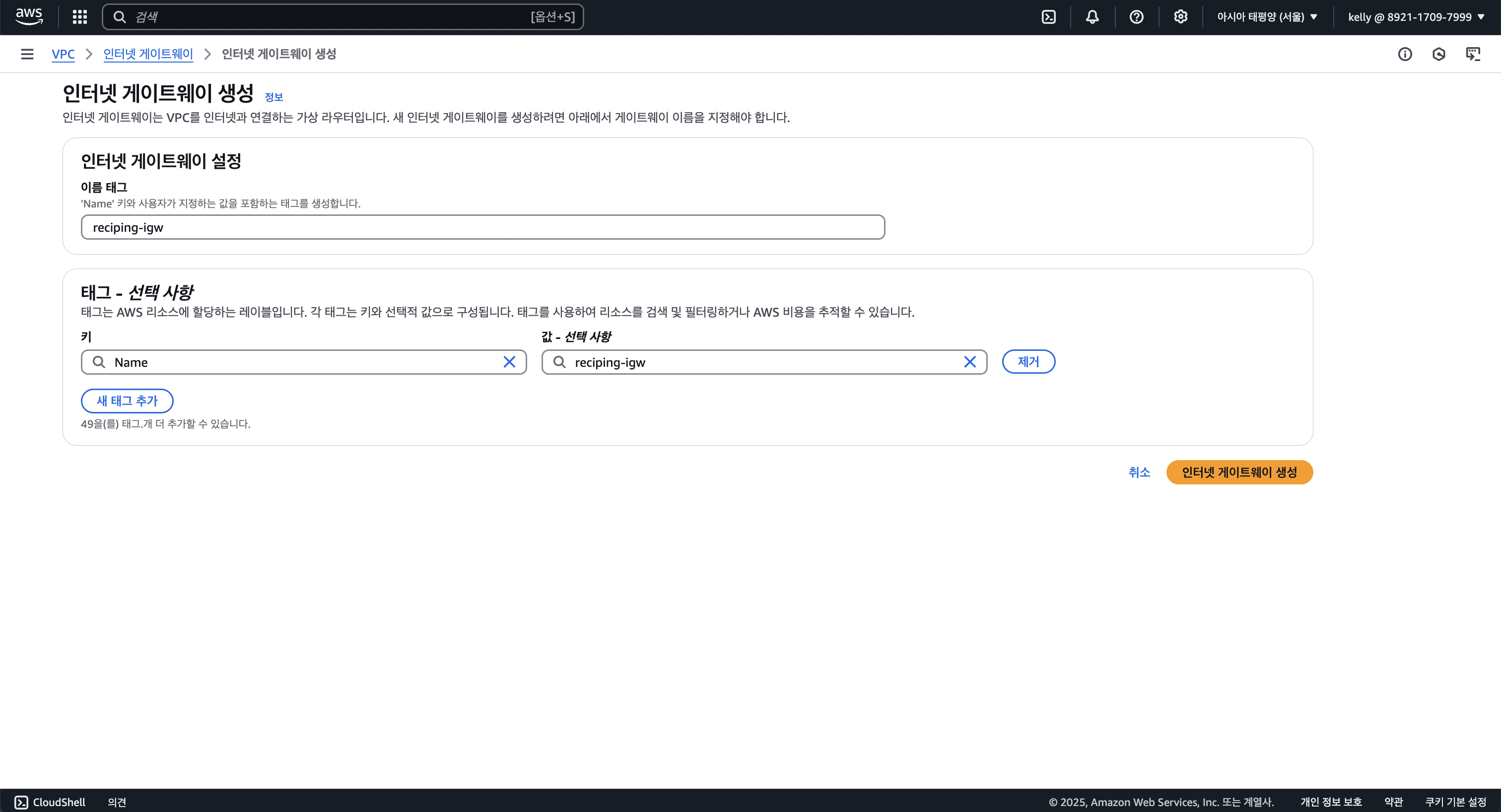 인터넷 게이트웨이 생성 클릭인터넷 게이트웨이 생성 클릭인터넷 게이트웨이 생성 완료만들어준 인터넷게이트웨이를 VPC와 연결해주어야 합니다. reciping-igw 선택 후, VPC 연결 클릭사용 가능한 VPC에서 recping-vpc 클릭 후, 인터넷 게이트웨이 연결 클릭VPC와 인터넷게이트웨이가 연결된 모습