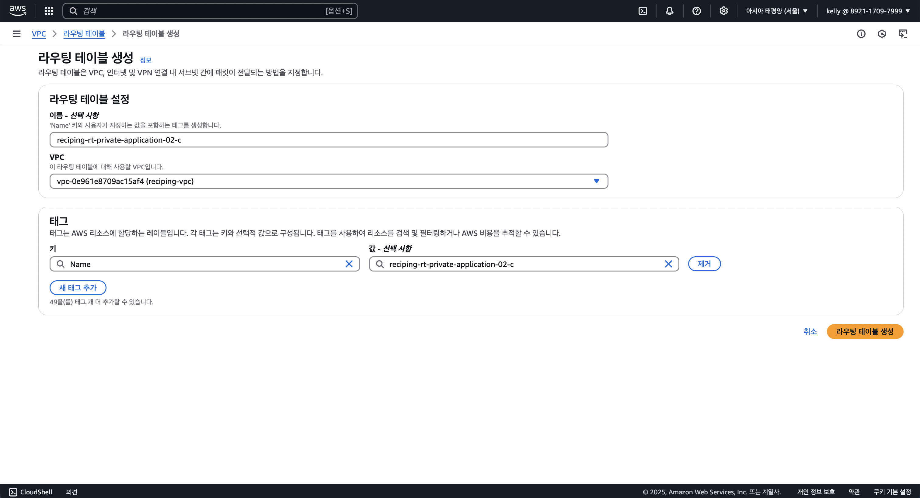 reciping-rt-private-application-01-a 선택 후, 라우팅 편집 클릭라우팅 추가 선택 후, NAT 게이트웨이 선택, 만들어둔 reciping-ngw-01 클릭 후 변경 사항 저장 클릭reciping-rt-private-application-02-c 선택 후, 라우팅 편집 클릭라우팅 추가 선택 후, NAT 게이트웨이 선택, 만들어둔 reciping-ngw-02 클릭 후 변경 사항 저장 클릭