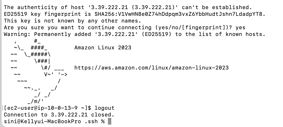 이 메세지의 의미는 ED25519 fingerprint는 해당 서버의 고유한 SSH 식별자로 처음 접속할 때 항상 나오는 메세지인데 서버가 내가 만든 EC2가 맞는지 물어보는거니 yes 입력