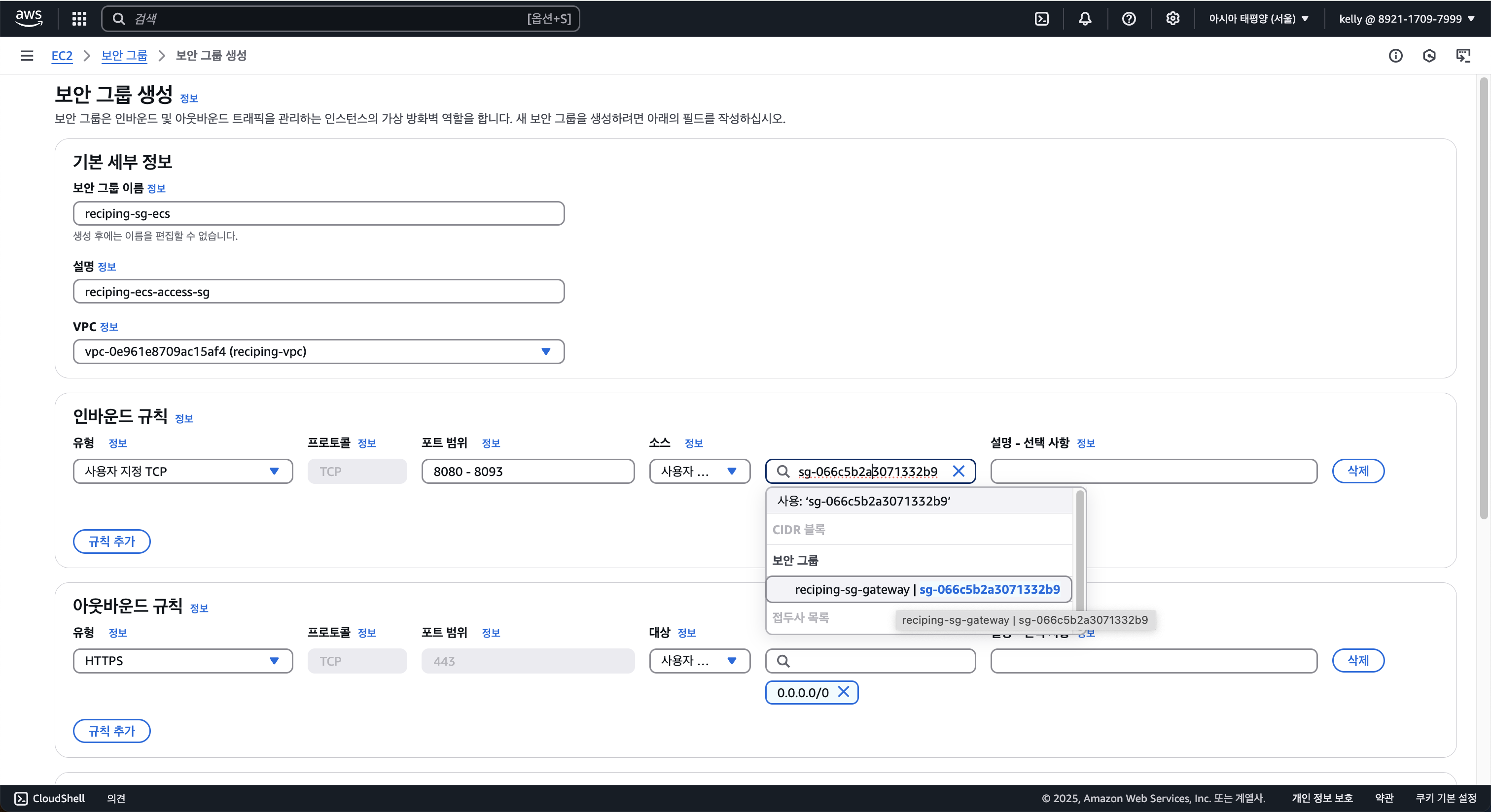 ECS용 보안그룹은 Gateway Server → ECS Task의 통신을 허용하는 역할이라서 Gateway Server 보안 그룹에서 오는 트래픽만 허용하겠습니다.