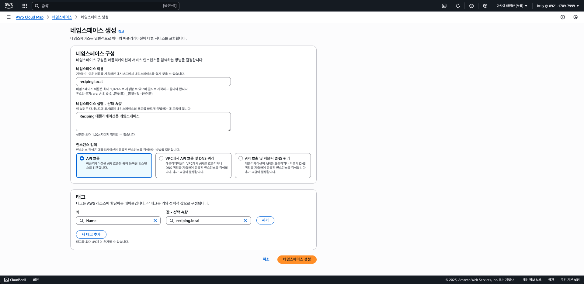 향후 Prometheus, CloudWatch, Service Connect 등을 고려하면 reciping-ns 같은 네임스페이스를 만들어 두는 것도 나쁘지 않기에 만들어두겠습니다.