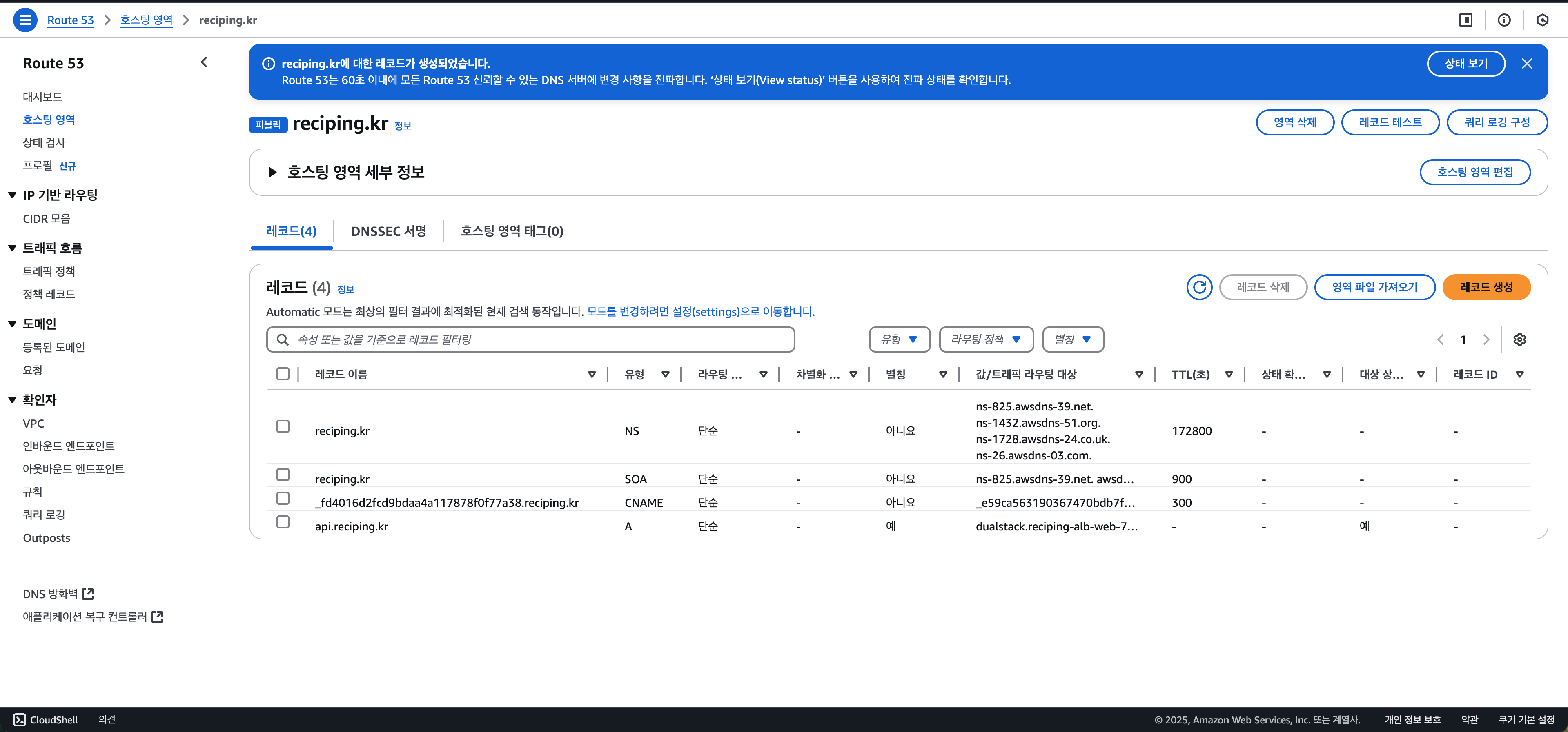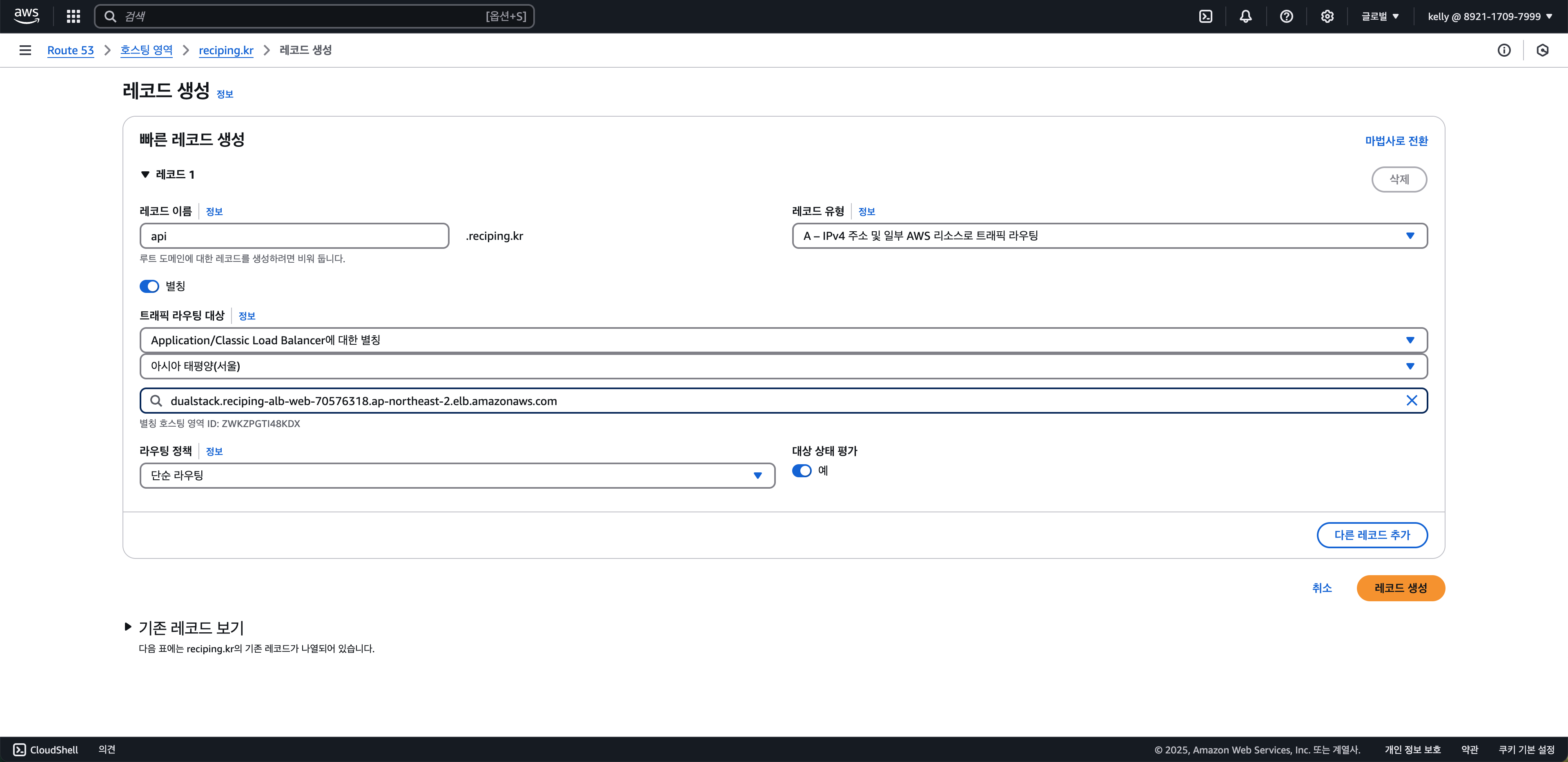 5. Route 53에서 A 레코드 생성 (api.reciping.kr → ALB)