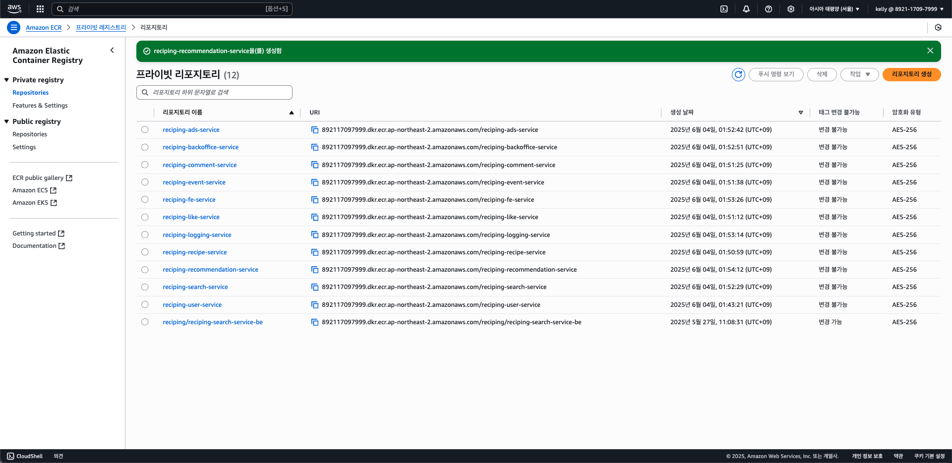 # 빌드한 도커 이미지'reciping-user-service:v1.0.0'를 태깅 후, ECR에 푸쉬