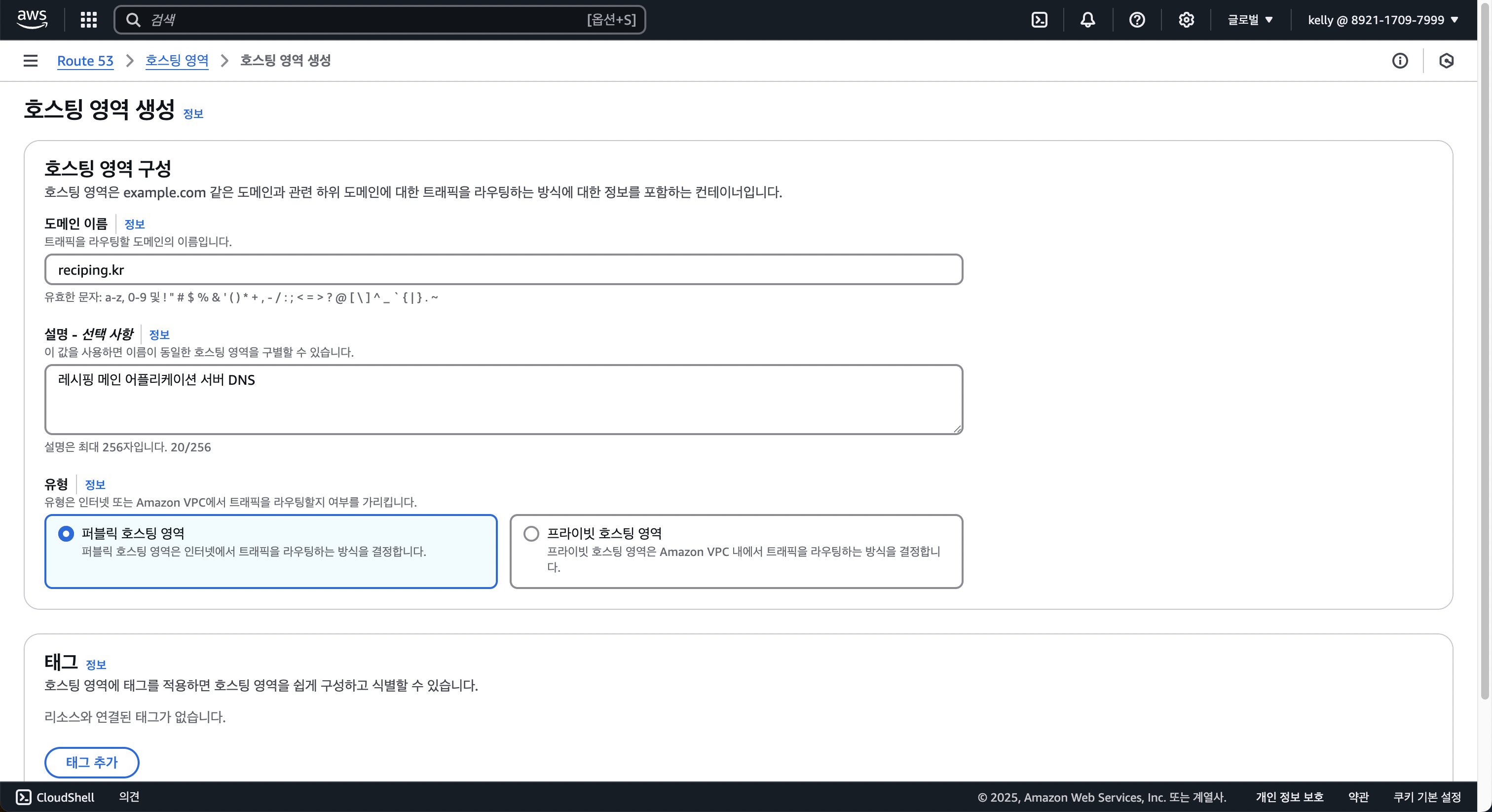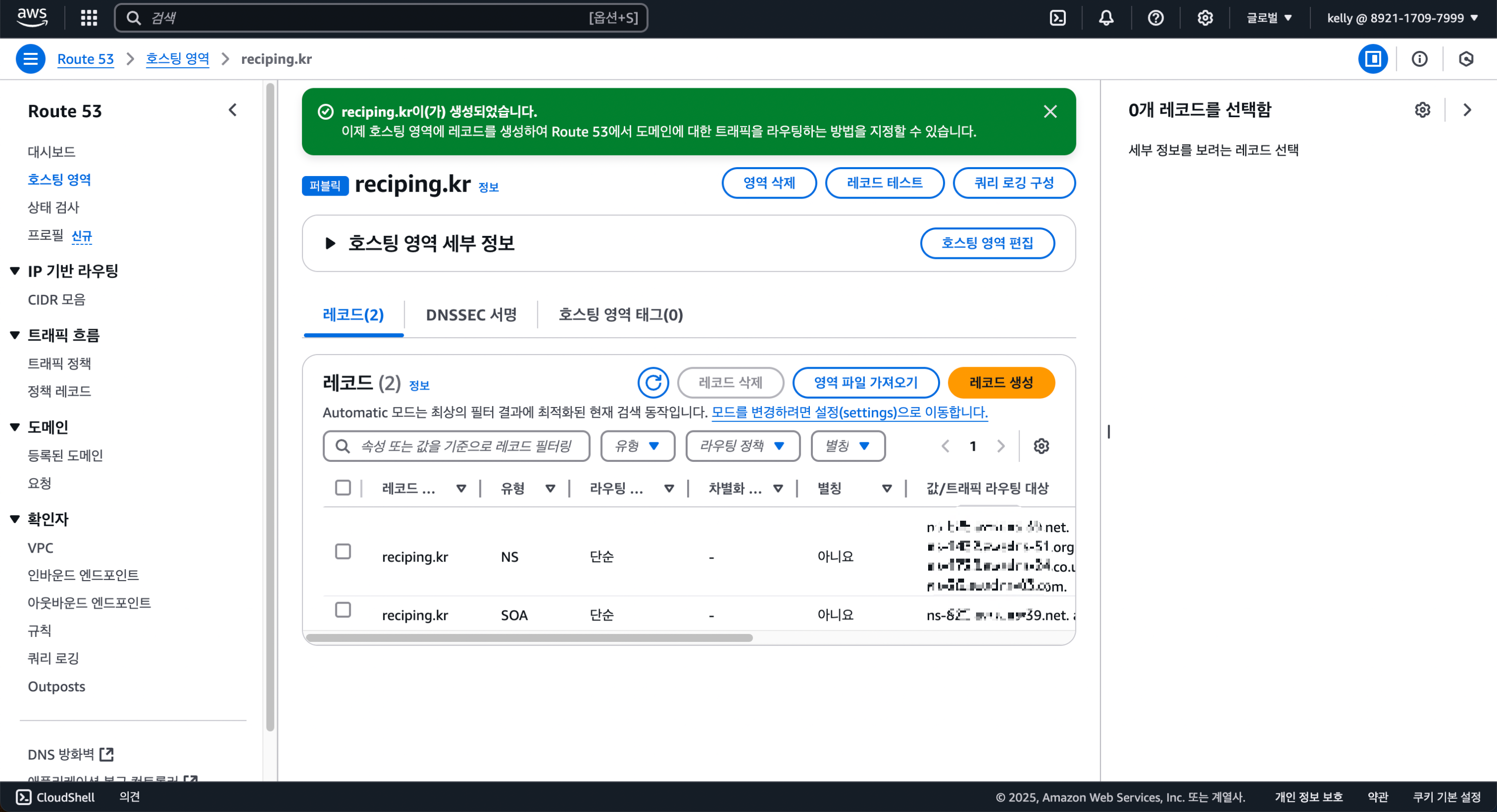 1. 호스팅 영역 > "reciping.kr" > 레코드 생성