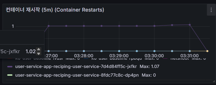 - 스위치 완료 : svc/reciping-user-service의 Grafana에서 오류율/지연 회복 확인
