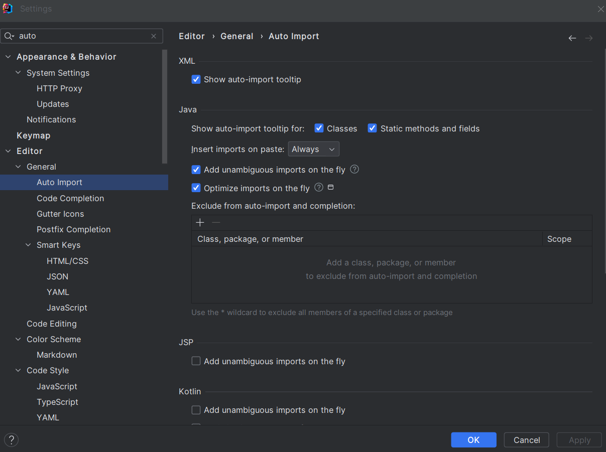 intellij settings - auto import 들어가기