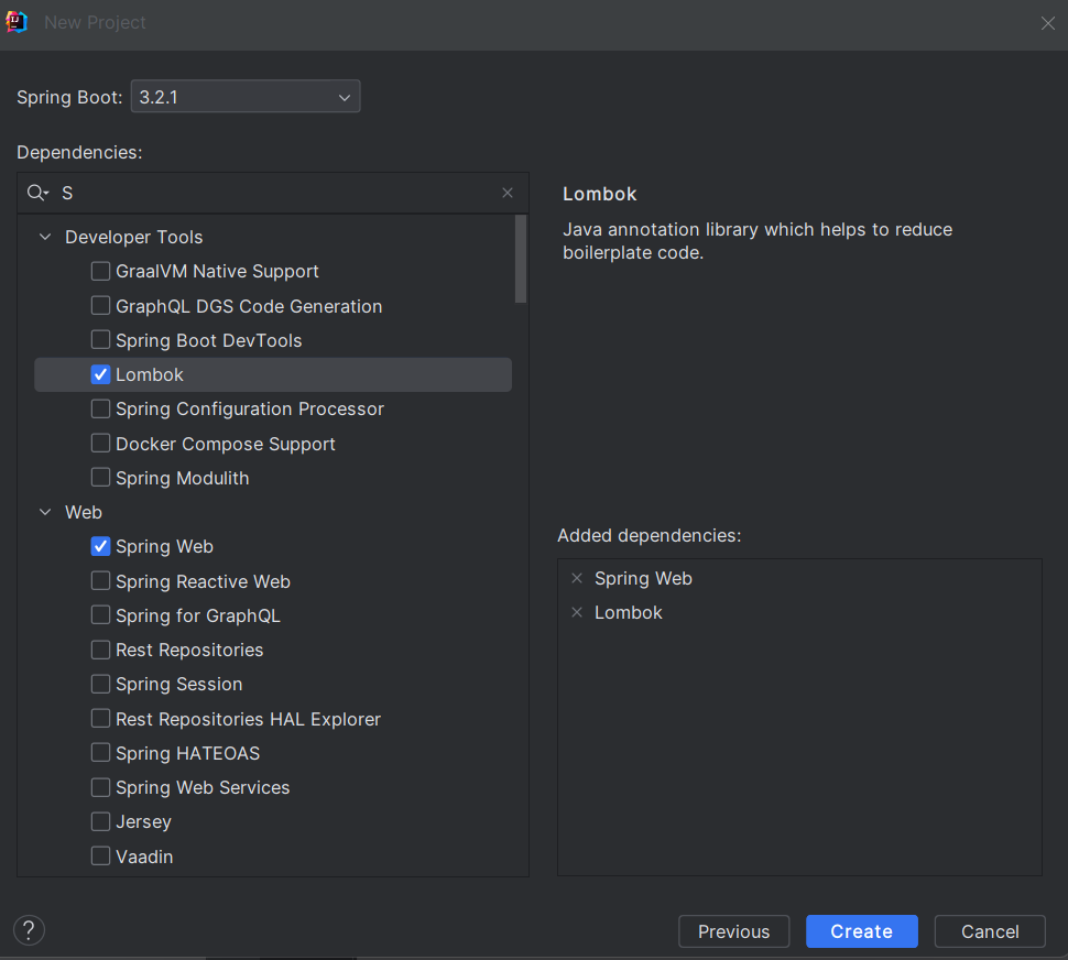 그 다음에 dependencies에서 lombok과 spring Web을 넣어준다.