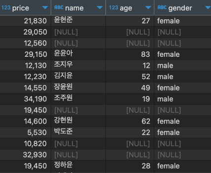 숫자인줄 알았는데 이런 식으로 컬럼명 옆에 ABC로 뜬다면 헷갈려서 오류날 가능성이 크긴 하다 -> 타입 변경하는 함수를 이용해도 된다!
