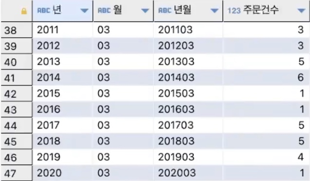 order by 1 -- 1번째 컬럼(년)을 기준으로 정렬하겠다