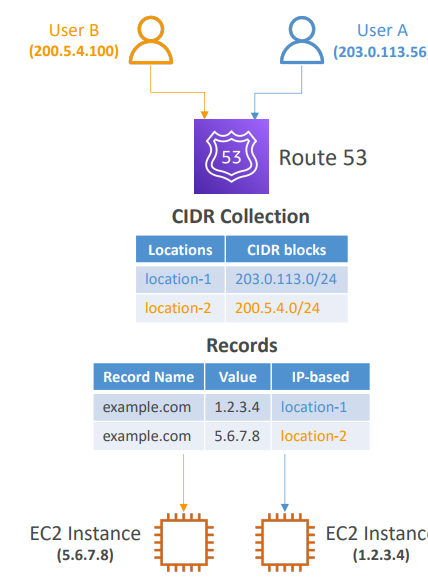 사용자 A가 로케이션 1 CIDR블록에 속하는 특정 IP로 들어오면 첫 번째 EC2 인스턴스인 IP 1,2,3,4로 보내진다. 두 번째 로케이션에 속하는 IP 주소로 들어오면 5,6,7,8로..! => 이렇게 되면 EC2 인스턴스에 대한 DNS 쿼리 응답을 받게 된다.