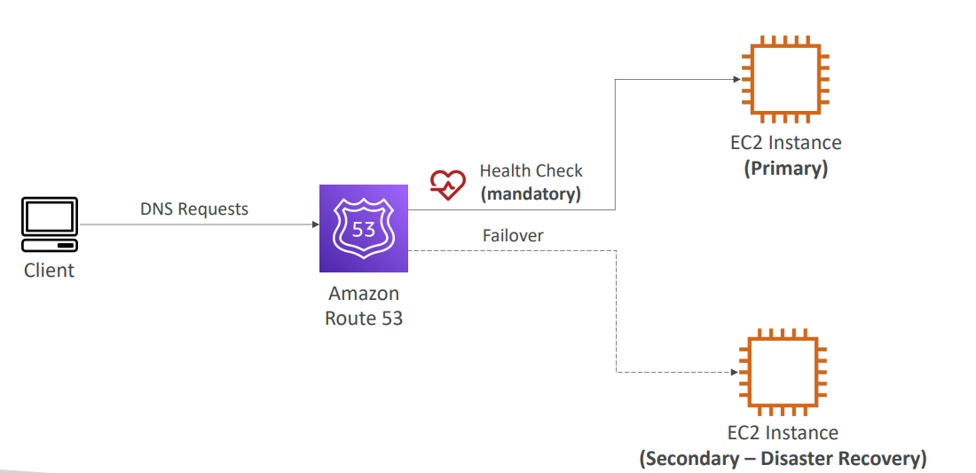 하나는 기본 EC2 인스턴스이고 두 번째 보조 EC2 인스턴스 혹은 재해 복구 EC2 인스턴스인데, 이 경우에는 Health Check과 기본 레코드를 필수적으로 연결한다. Health Check가 비정상이면 자동으로 Route53은 두 번째의 EC2 인스턴스로 failover(장애조치)를 하고 결과를 보내기 시작한다!