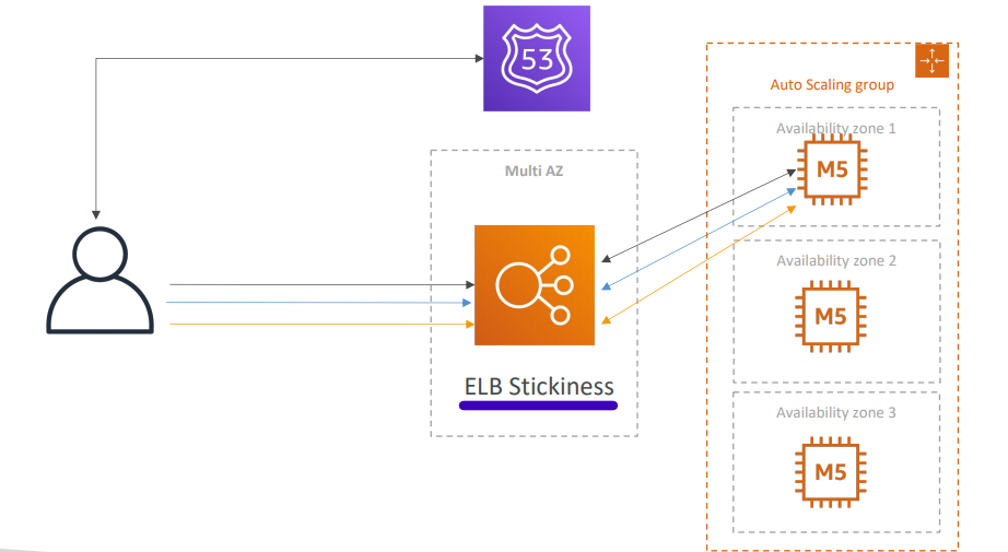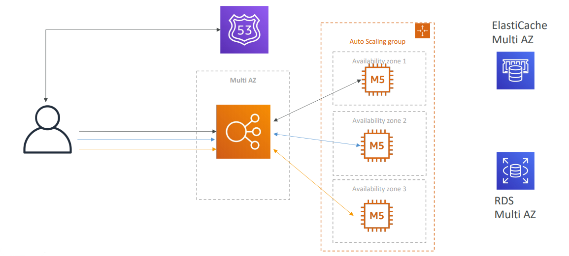 사용자가 있고 Route53이랑 다중AZ ELB가 있고 오토 스케일링 그룹과 세 개의 AZ가 기본적으로 있다.