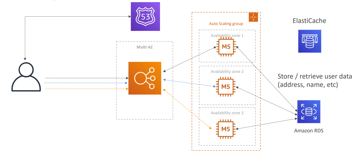 RDS와 직접 통신함으로써 주소, 이름 등의 사용자 데이터를 저장하거나 불러올 수 있다. 그리고 각각의 인스턴스가 RDS와 통신할 수 있고 일종의 다중AZ stateless 솔루션을 효과적으로 얻을 수 있다!
