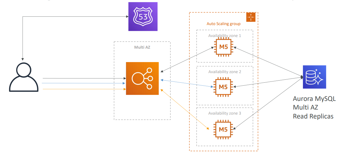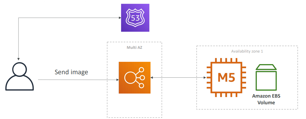 하나의 EC2 인스턴스가 있고 하나의 EBS볼륨이 연결되어 있는 단일 AZ의 아주 단순한 아키텍처인데 이거는 로드 밸런서에 연결되어있는 형태이고 사용자는 로드 밸런서로 이미지를 보내고 싶을 것이다.